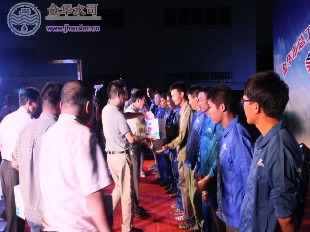 市政協(xié)副主席、總工會主席朱恒錢出席并致辭。市總工會黨組書記、常務(wù)副主席蔣永根,市總工會副主席鄭愛軍,副調(diào)研員、經(jīng)濟(jì)技術(shù)事業(yè)部部長卜維亞;金華市住房和城鄉(xiāng)建設(shè)局副局長張?zhí)旒儭⒕种睂贆C(jī)關(guān)黨委副書記李克力,以及施工方杭州市市政工程集團(tuán)有限公司黨委書記、工會主席王歡及業(yè)主方公司總經(jīng)理吳立新率公司領(lǐng)導(dǎo)班子也一同出席活動。領(lǐng)導(dǎo)們向在“五水共治”中付出辛勤勞動的工人師傅們送上飲料等防暑物品,并致以親切的慰問。