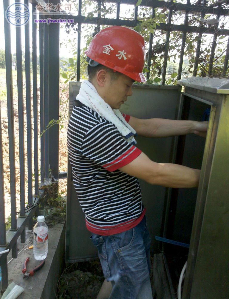 圖為公司生產設備處技術人員冒著酷暑高溫,對金華市機動車駕駛員考試中心附近的金三角流量計進行檢查維修。(程樂翔)