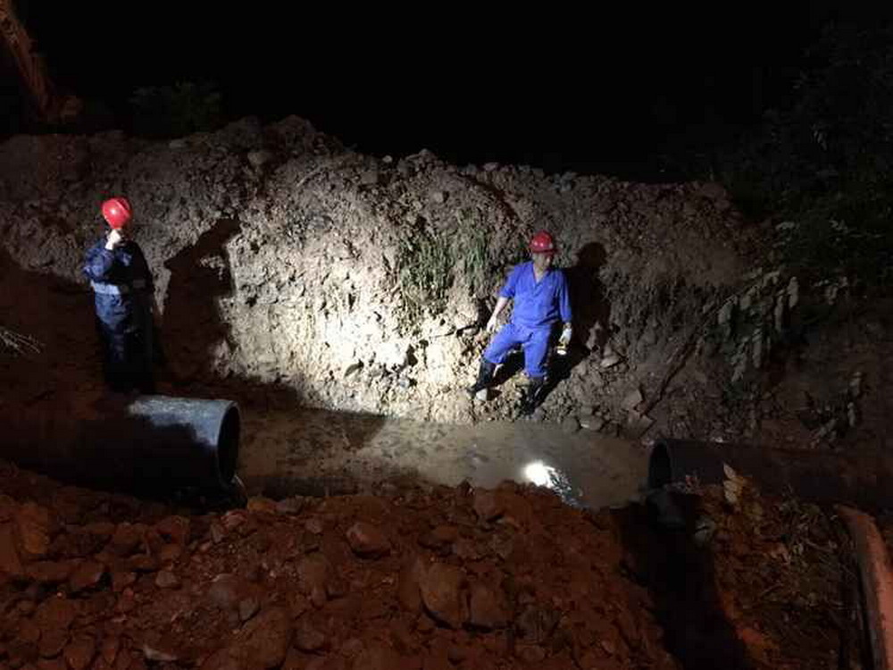 當天下午4時許,公司中控室值班人員發現金安公路沿線的自來水管線流量增大,而管網壓力卻減小,同時附近有用戶打來電話稱沒有自來水了。值班人員初步判斷是自來水爆管所致。接到險情后,公司相關部門領導立即沿線查找。由于自來水管線埋在地下,沿途有水溝流水,而發生爆管的管線沒有水流流出,致使查找十分困難。天很快黑了,大家打著手電繼續查漏。夜里9時許,正在第二水廠檢查防臺抗臺工作落實情況的其他部門負責人聞訊后也趕到現場,經過大家共同努力,在夜里近11點鐘,終于發現有一口水塘里的水十分渾濁,并且水塘附近有部分泥土很潮濕,經過仔細判斷,最終確定了爆管所在位置。這時,早已等候在附近、安排好搶修人員和管材等的應急搶修保障處、水電安裝隊的干部職工立即組織人員投入搶修工作。