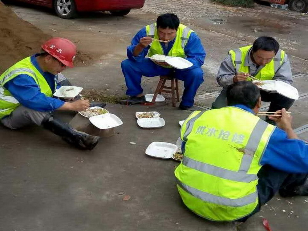 因為管道在地下,需要開挖道路,搶修人員到達現場后,首先做好安全防護工作,以確保道路安全和搶修安全。搶修中,大家肚子餓了,就坐在路邊隨便扒拉幾口盒飯,然后繼續搶修。天空一直下著大雨,氣溫也驟然下降,寒風陣陣,但我們的搶修人員一直堅守崗位,終于在晚上20點30分左右完成搶修,恢復供水。搶修人員仍然冒著大雨,填平道路并沖洗清掃,恢復現場道路的通暢與干凈后才放心離開。