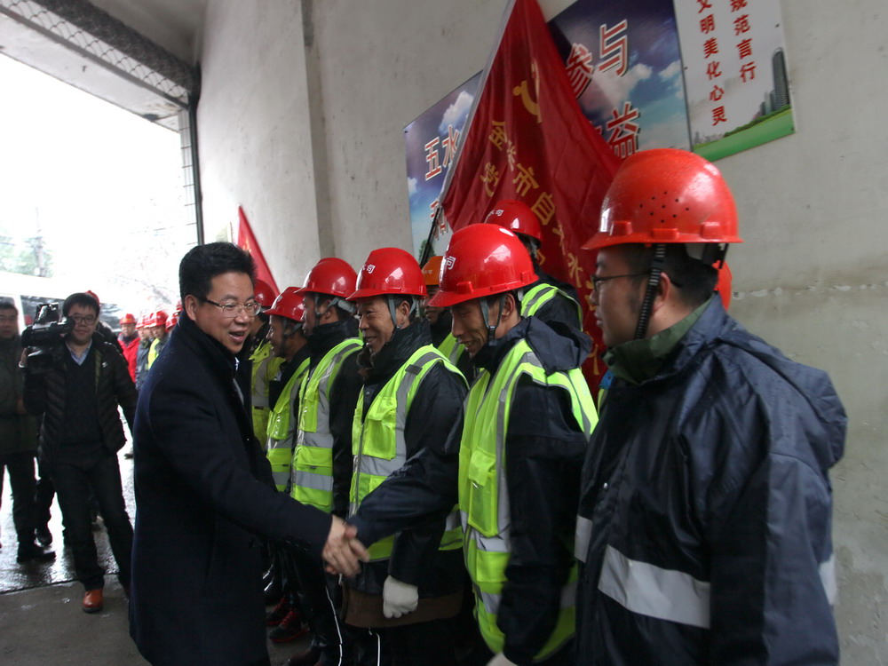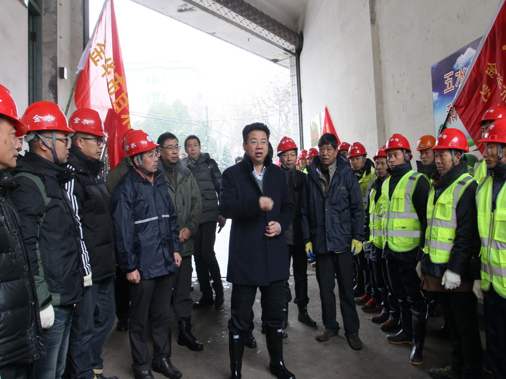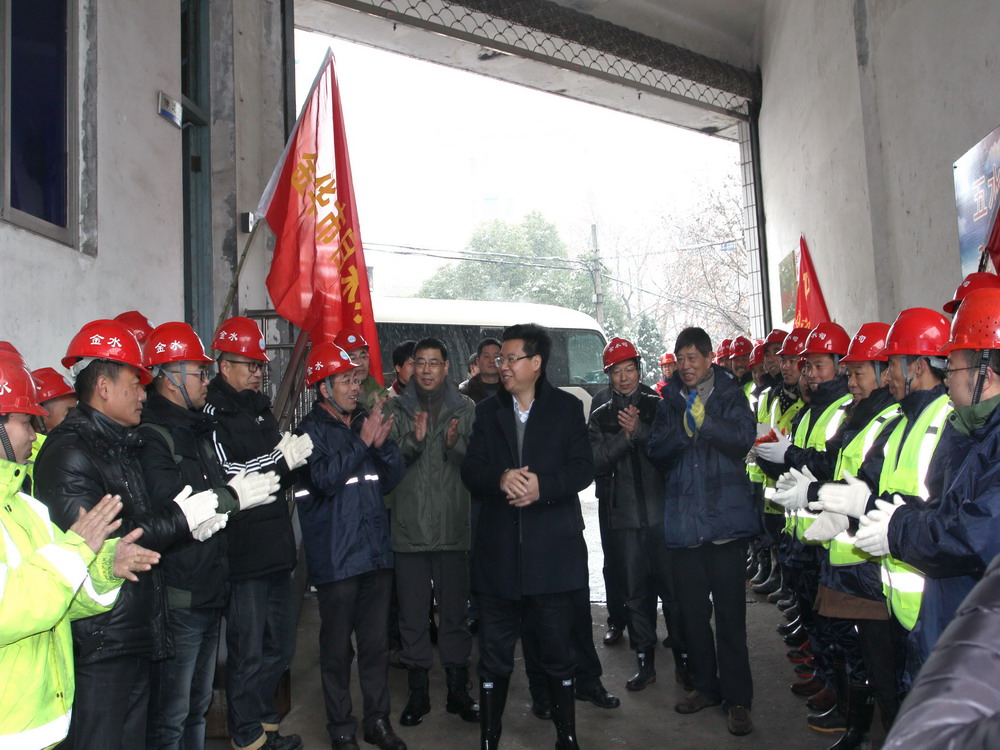 在公司河盤橋應急搶修保障處,暨軍民市長與全體管道搶修隊員們逐一親切握手,代表市委、市政府向供水職工表示親切慰問,對他們在嚴寒天氣下堅守崗位、辛勞工作的精神表示感謝,叮囑他們要注意防寒保暖。他強調指出,在當前寒潮來臨、氣溫大幅下降的嚴峻形勢下,為保障金華市民用水,市自來水公司壓力大,任務繁重而光榮。他要求大家齊心協力,確保供水安全、市民正常用水。他還特別囑咐公司杜樂雙總經理,要保障管道搶修隊員們身體暖和,休息充分,以良好的精神狀態投入供水搶修工作之中去。杜樂雙總經理表態要堅決落實好。