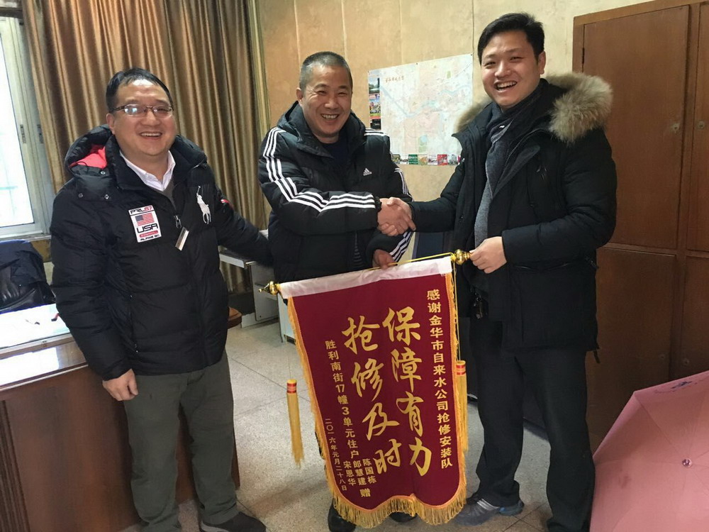 1月29日下午,家住金華市勝利南街17幢3單元的居民們,頂著寒風,帶著感激之情,把一面印有“保障有力,搶修及時”的錦旗送到了公司應急搶修保障處。對公司搶修人員冒雪及時搶修、保障小區居民正常用水表示感謝。