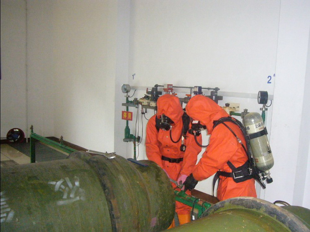 現場演練模擬了加氯間氯瓶泄漏、報警、報告、啟動應急預案、搶險人員搶險及搶險結束后對現場環境的檢測。演練之后,針對自給正壓式消防空氣呼吸器、防化服的穿戴和液氯鋼瓶應急堵漏工具的使用進行強化訓練,對個別員工不規范的穿戴、使用方式進行糾正。