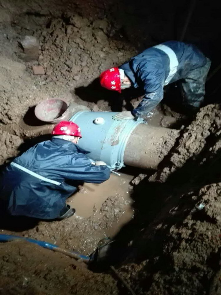 應急搶修保障處于是立即派遣工作人員攜帶相關設備趕赴現場進行搶修,同時派遣挖掘機趕往現場進行作業。經過機械結合人工開挖,排水后發現為埋深1.5米處的dn400水泥總管破裂。搶修人員采用dn400大頭哈夫進行搶修,經過大家冒雨連續搶修,直至晚上8點完成修理工作,恢復正常供水。