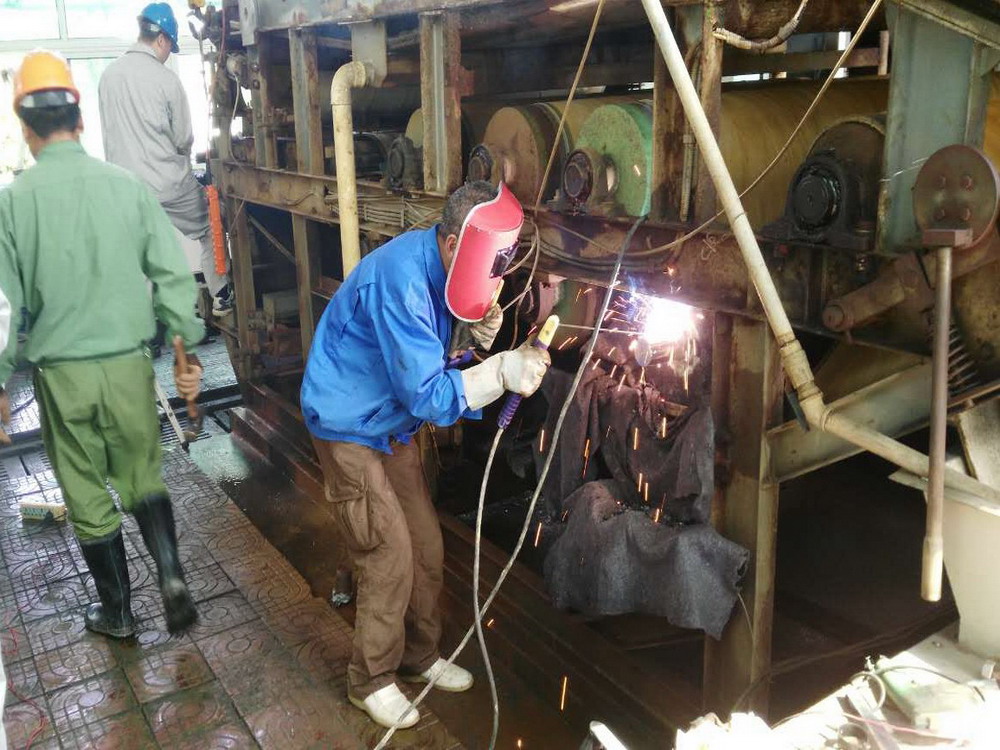 4月12日上午8時30分起,機修班組全體職工對故障設備進行維修。盡管工作量大,條件艱苦,工作環境中充斥著污泥的惡臭,但為了污泥處理系統能盡早的正常運行,大家始終堅守在崗位上。經過八個多小時的努力,完成了兩臺帶式壓濾機的大修,更換破損轉軸1根,濾帶1根,破損軸承2個,磨損的尼龍刮板30余根,于當天下午5時重新投入運行。 (趙汀/文 江紅星/攝)