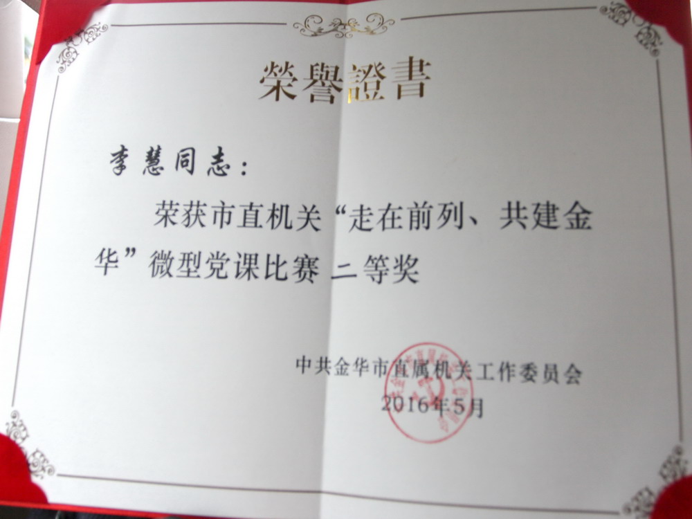 5月13日上午,公司選手李慧在市直機關“走在前列 共建金華”微型黨課比賽中,榮獲二等獎。