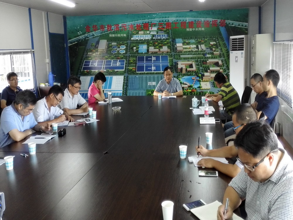 在金華市秋濱污水處理廠三期工程項目部,金華市水處理有限公司召集施工、設備、設計、監理及跟蹤審計各參建單位領導及項目負責人召開會議。各項目單位在會上匯報上半年項目質量、安全、文明施工情況及形象進度情況;目前碰到的主要困難和問題;以及下半年完成項目質量、安全、投資、進度目標的具體計劃及保障措施。