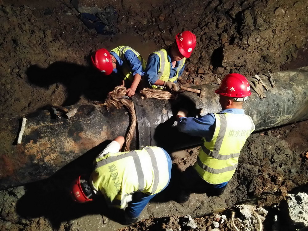 情況緊急,公司應急搶修保障處和水電安裝隊立即派遣搶修人員攜帶相關搶修設備趕赴現場進行搶修。搶修人員首先對開挖路面進行回填,然后重新安裝dn600球墨總管,最后搶修人員采用dn600套筒結合打頭子的方式進行修復,經過連續搶修,直至晚上24點完成搶修,恢復正常供水。