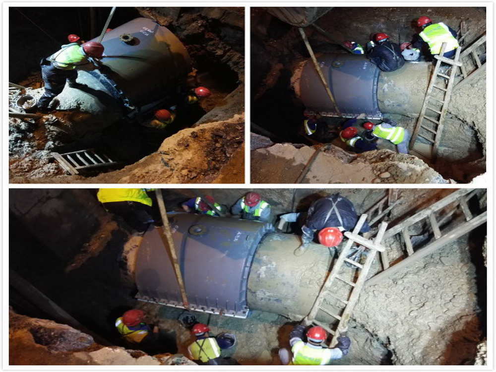經過機械結合人工開挖,排水后發現為埋深3.5米處的dn1200水泥總管連接處漏水。為了不影響市區正常用水,搶修人員決定帶水作業,采用dn1200哈夫進行修復,雖然這大大提高了搶修難度,但經過連續20個小時搶修,終于在3月2日凌晨4點完成修理,確保了正常供水。