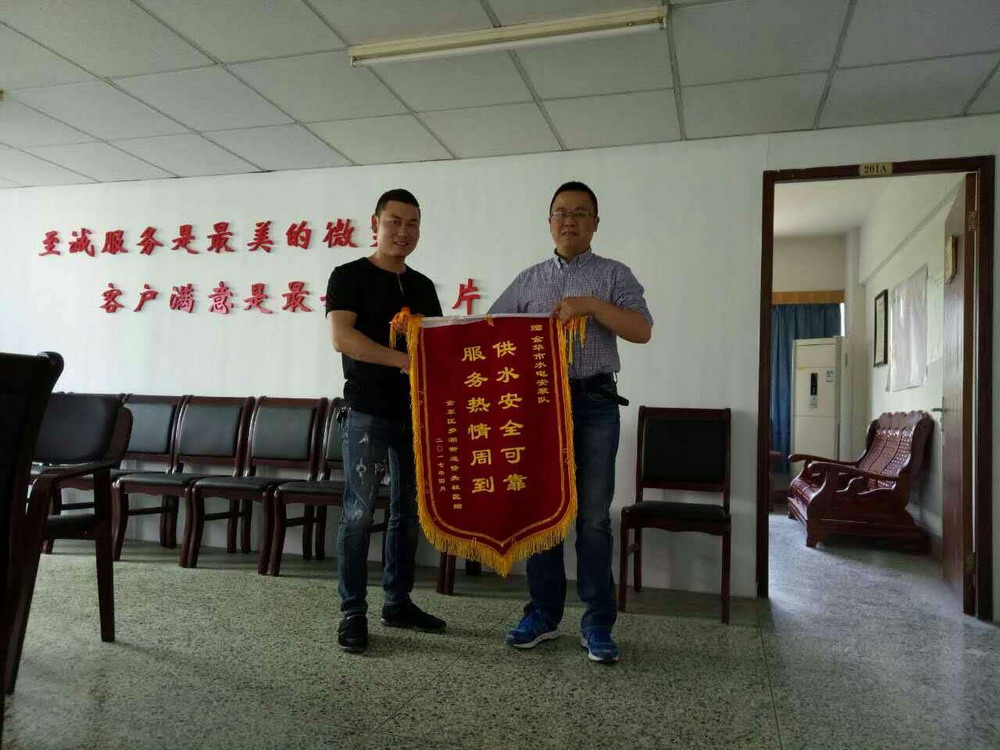 2017年4月24日,金華市金東區(qū)多湖街道驛頭社區(qū)的工作人員給金華市水電安裝隊(duì)送來了大紅錦旗,贊揚(yáng)安裝隊(duì)“供水安全可靠,服務(wù)熱情周到”,對(duì)安裝服務(wù)工作表示真誠感謝。