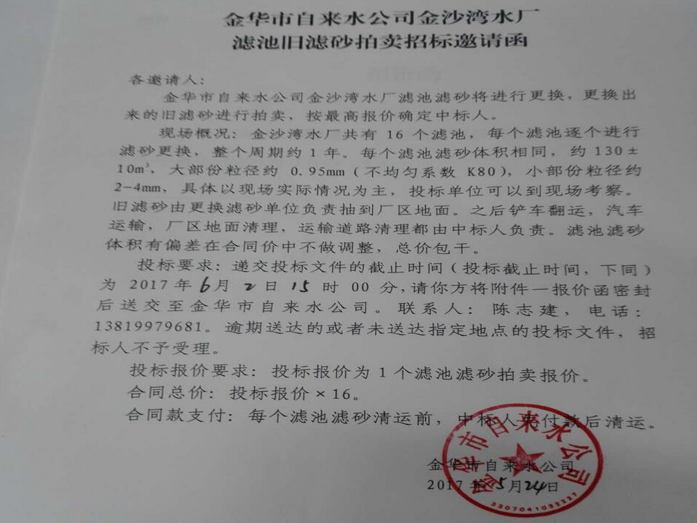 金華市自來水公司金沙灣水廠濾池濾砂將進(jìn)行更換,更換出來的舊濾砂進(jìn)行拍賣,按最高報(bào)價(jià)確定中標(biāo)人。