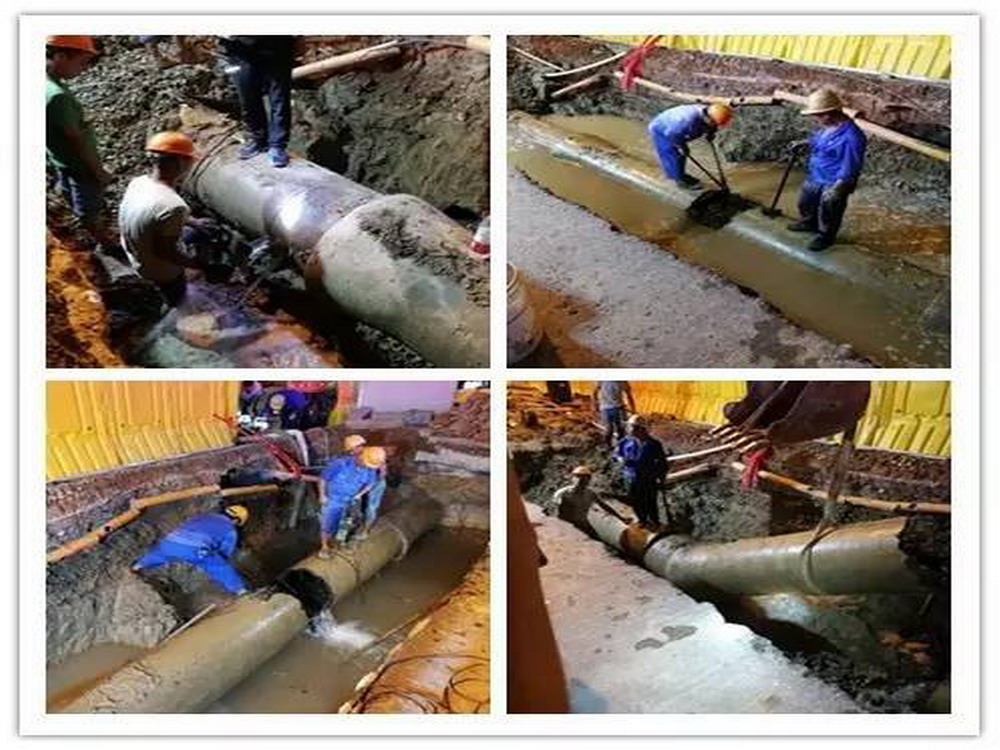 8月7日晚上7:30分,工作人員便開始忙碌了,關閥排水是停水的第一步,對于大口徑管道的關閥排水,必須在停水前便開始實施。切割、放水、抽水、破管....水泥管拆卸完成后,便開始安裝新的管道與配件。老水泥管與新管的接口處必須靠人工進行打頭子,才能避免漏水,施工人員安裝完管道配件后,又馬不停蹄的開始了打頭子,然后對管道進行填實養護,一直忙碌到凌晨4:05分,順利通水,比預先通水時間提早了近4個小時。
