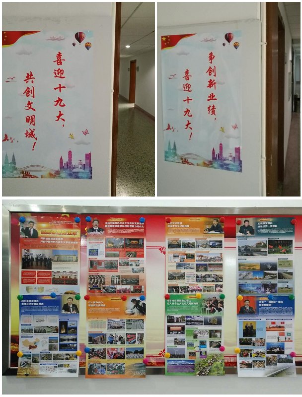 “以優異成績迎接黨的十九大勝利召開!”、“爭創新業績,喜迎十九大!”,一幅幅艷麗喜慶且振奮人心的主題標語醒目的張貼在公司辦公大樓各個樓層、墻面。在公司樓廳宣傳欄里,張貼了“砥礪奮進的五年”6幅宣傳畫,全方位的向公司干部職工介紹了祖國各方面建設所取得的新成就……為黨的十九大勝利召開營造出濃厚的充滿正能量的宣傳氛圍。