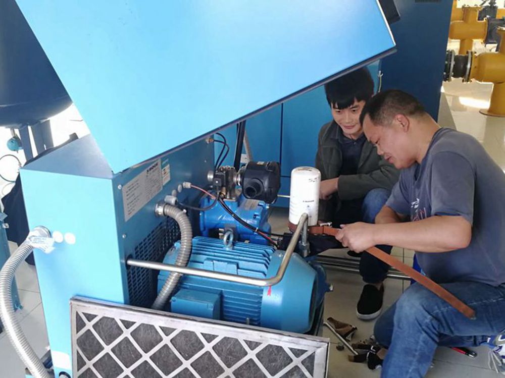 近日,公司仙源湖水廠鼓風機房2#空壓機保養時間到期,水廠職工在廠家協助下,完成了對空壓機的保養工作。