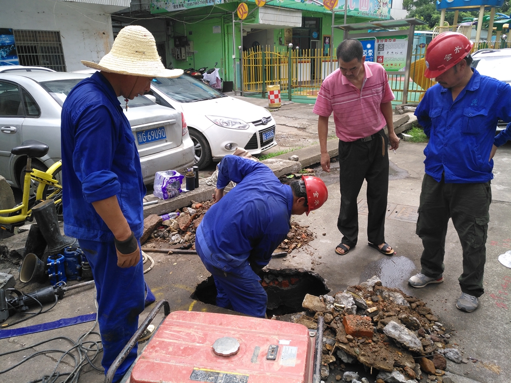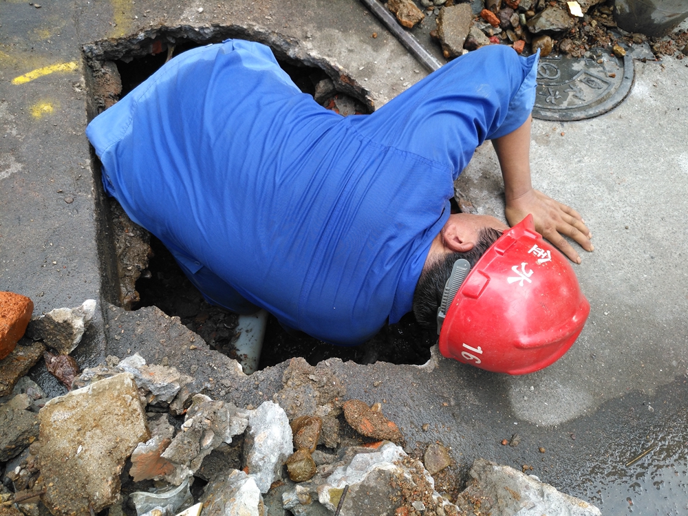 與此同時,在市區南苑小區 后姜街6弄6號,由于水管漏水,薛桂龍、申洪書兩位師傅正在緊張地搶修。他們用鐵釬挖開堅硬的水泥路面,用鐵鍬將路面下的碎石、沙子等搬運上來,一會兒工夫,地面下的漏水的水管就暴露在眾人眼前。兩位師傅輪流站在挖出的狹小坑洞里,清理漏水管周邊的碎石。天氣炎熱,一會兒兩人全身都被汗水濕透了,厚厚的工作服濕淋淋的,衣袖上還不斷滴下汗水。薛桂龍師傅俯下身子,臉貼路面用手觸摸水管漏點,水管邊上就是其他單位的地下管道,這使得維修更加復雜、困難。經過一番探查,薛桂龍師傅基本判定下面管材是dn110×dn75的三通漏水了。由于正值中午時分,周邊居民十分關切何時能恢復通水,為不影響大家做午飯,搶修人員暫時開啟閥門恢復供水,待大家吃過午飯后再繼續關閉閥門進行修理,直至修好為止再收工。