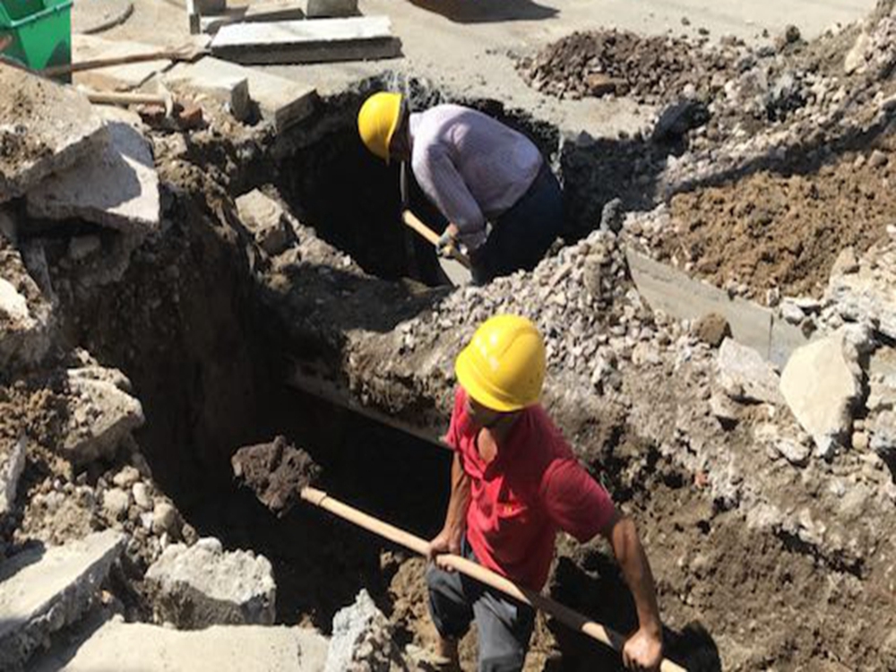 芙峰街施工現場原先地下管線走向、埋深、間距范圍等方面原始資料缺乏,并且所處環境錯綜復雜,給自來水管道的改造施工帶來不小的難度。施工期間正值三伏天,然而施工人員毫無怨言,時常冒著酷暑奮戰在第一線。由于現場都是一片空曠地,一線員工無論是在安裝管道時,還是想小憩時,不要說是大樹,即便是想找小樹苗下的陰影也是一種奢望。但施工人員自始至終沒有怨言,渴了大口喝水,汗水流進了眼睛、浸濕了衣襟,卻絲毫也不停下手中的活。