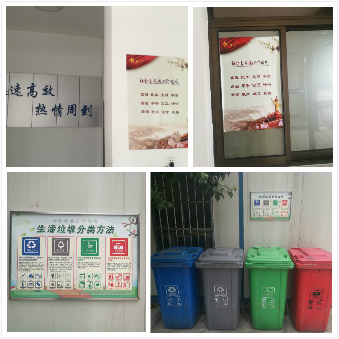 公司已購置100升四分類垃圾桶12只,50升二分類垃圾桶14只,二分類垃圾桶20只,及時分發,布置到位。聯系制作了“可回收”、“其他垃圾”貼紙120張,并粘貼到相應垃圾桶上。公司各部門“社會主義核心價值觀內容”、“未成年人教育保護及健康成長內容”、“新時代金華精神”、“垃圾分類知識”等創建文明城市公益廣告已完成制作安裝,有電子顯示屏的地方則做到滾動播出,均能按測評標準要求設置到位。