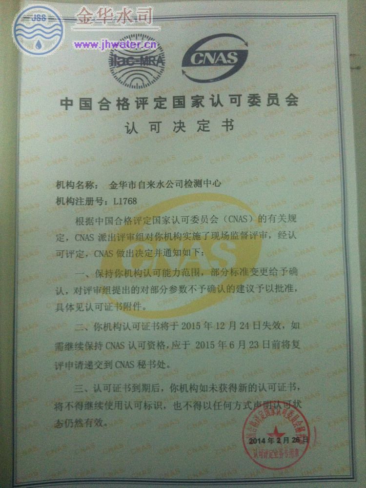 近日,金華市自來水公司檢測中心收到中國合格評定國家認可委(cnas)維持認可證書。